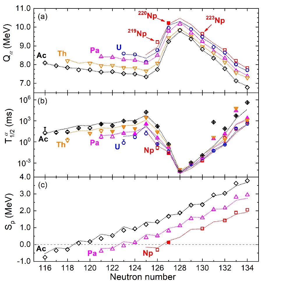 图2:89 ≤ Z ≤ 93缺中子核素的α衰变Q值(a)和半衰期(b)的系统性规律,以及奇Z核Ac、Pa、Np同位素的单质子分离能随中子数变化的系统性(c)。