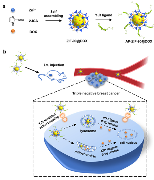 图1 Y1配体修饰的ZIF-90@DOX的合成路径及其在三阴性乳腺癌的靶向治疗中的应用