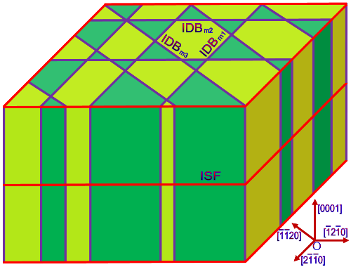 图4、层错(ISF)和倒反畴界(IDB)交织在一起构成三维缺陷网络的示意图。三维缺陷网络将w-BN分割为平均尺寸约十几纳米的棱柱体,相邻的棱柱体具有相反的晶体极性。