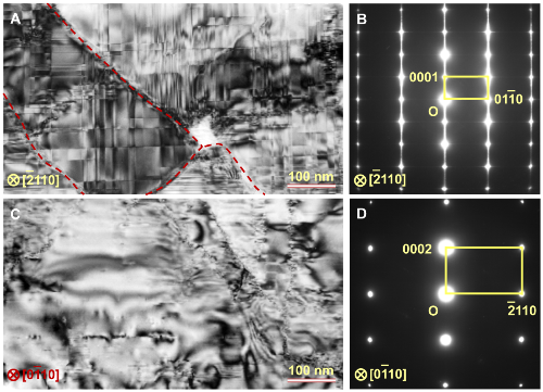 图2、纤锌矿型氮化硼的显微结构。(A,B)沿[-2110]晶带轴的TEM明场像(a)和相应的选区电子衍射(b)。材料中形成了(0001)界面上的层错(ISF)和(01-10)棱柱面上的倒反畴界(IDB)组成的两类平面缺陷。红色虚线表示晶界。(C,D)沿[0-110]晶带轴的TEM明场像(C)和相应的选区电子衍射(D)。从中可在在(-2110)面上没有平面缺陷。