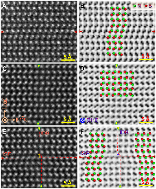 图3、纤锌矿型氮化硼的层错(ISF)和倒反畴界(IDB)的原子结构。(A,B) 层错的HAADF像(A)和相应的ABF像(B)。层错改变了w-BN原子层的堆垛顺序。 (C,D) 倒反畴界的HAADF像(C)和相应的ABF像(D),倒反畴界改变了材料的晶体极性。(E,F) 层错(ISF)和倒反畴界(IDB)交叉区域的HAADF像(E)和相应的ABF像(F)。两组垂直的平面缺陷交叉在一起形成了“层错-倒反畴界结”,并形成了柏氏矢量为1/3[10-10]的混合型不全位错。