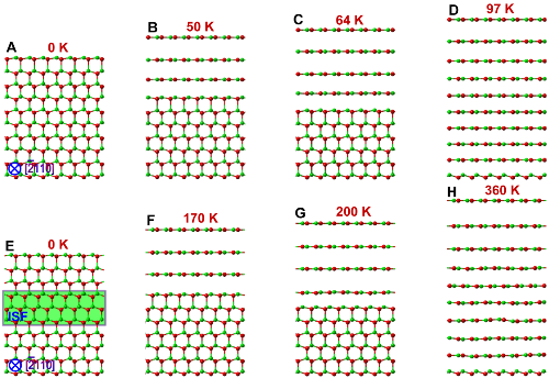 图5、第一性原理分子动力学模拟分析层错(ISF)对w-BN热稳定性的影响。(A–D)完美w-BN的结构演变过程。随着温度的升高,w-BN逐渐转变为类h-BN结构,温度升到97K时相变完成。(E–H)包含一个层错(ISF)的w-BN的结构演变过程。层错可以显著地抑制w-BN的相变,该结构的完全相变温度为360 K。