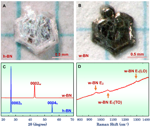 图1、利用六角氮化硼(h-BN)高温高压条件下相变的方法制备的纤锌矿型氮化硼(w-BN)晶体。 (A)高质量六角氮化硼单晶,(B) 合成的纤锌矿型氮化硼晶体为黑色,(C) 晶体相变前后的X射线衍射图; (D) 纤锌矿型氮化硼的拉曼光谱。
