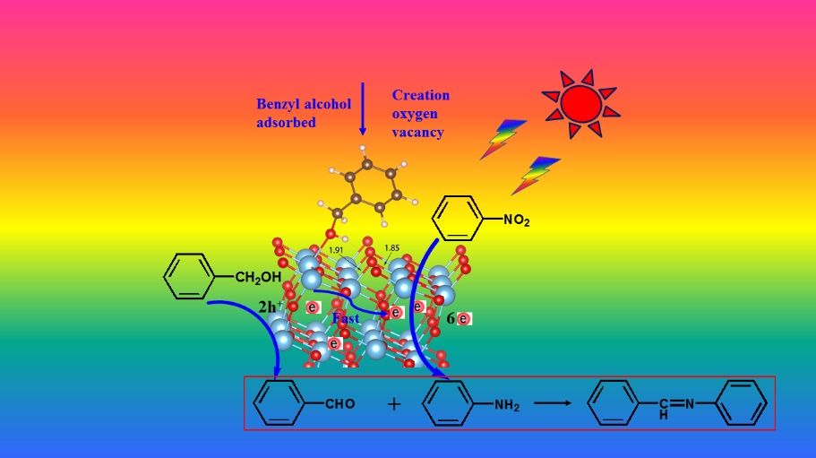在国家重点研发计划、中科院战略性先导科技专项和国家自然科学基金等的资助下,福建物构所结构化学国家重点实验室曹荣和高水英团队,在可见光催化氧化反应和还原反应耦合在一个光催化反应体系中取得了新进展。该团队巧妙地将苯甲醇氧化以及硝基苯还原反应耦合到同一个体系当中。通过理论计算以及顺磁共振证明了反应过程中在二氧化钛表面有大量的氧空位形成。这种在反应过程中原位生成氧空位的方法避免了高温高压的苛刻条件,同时也有效拓展了体系的可见光吸收范围。该耦合体系中无需任何牺牲剂,光生电子用于硝基苯还原反应,而具有强氧化性的空穴可以催化苯甲醇还原,极大促进了光生载流子的分离及利用,光催化活性显著。上述结果发表在催化类期刊Journal of Catalysis上( 2019, 373 116-125)。