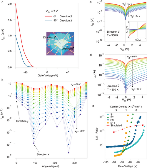 近期,中国科学院金属研究所沈阳材料科学国家研究中心研究人员与国内多家单位合作,发现了二维极限下层状半导体材料碲化镓(GaTe)面内电导率的巨各向异性,并实现了在门电压调控下电学各向异性几个数量级的变化,最后进行了相关原型器件的演示。该项研究工作于5月24日在Nature Communications杂志在线发表(DOI: 10.1038/s41467-019-10256-3)。