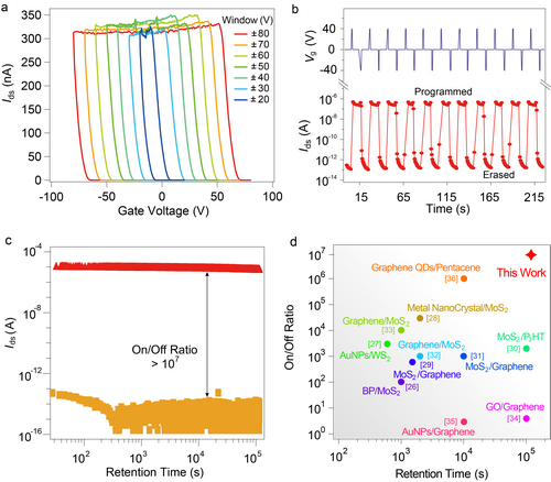 图2 堆叠范德华结构(h-BN/Graphene/h-BN/GaTe/h-BN)浮栅存储器的性能展示