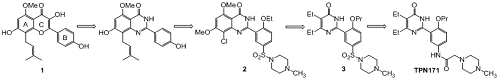 长期以来,中药和民族药为当今生命科学和医学发展提供了取之不尽、用之不竭的创新源泉。TPN171研究团队从上海药物所传统中药与天然产物化学的历史积淀中获取创新灵感,在中药淫羊藿的提取物中发现了具有较高磷酸二酯酶(PDE5)抑制活性的黄酮类化合物1,并以此天然产物为先导结构,通过对B环和C环进行骨架跃迁和结构优化后,得到了先导化合物2,其对PDE6的选择性更高【1】(比西地那非高100倍以上)。