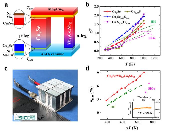 (a) Cu2Se/Yb0.3Co4Sb12热电器件结构示意图;(b) 代表性类液态热电材料的热电优值;(c) Cu2Se/Yb0.3Co4Sb12热电器件实物图;(d) Cu2Se/Yb0.3Co4Sb12热电器件能量转换效率和长时间恒温老化下的输出功率变化。