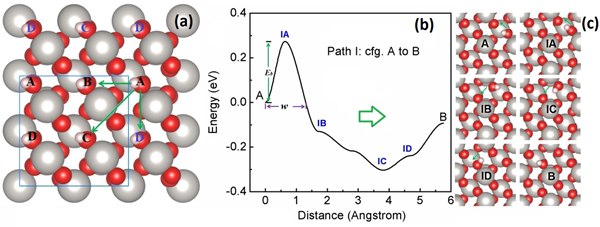图1. (a) 氢原子在β-PtO2(001)面扩散示意图;(b) 从位型A扩散至位型B的最优能量路径; (c) 从位型A扩散至位型B对应的一些中间吸附态。