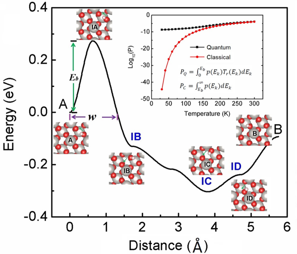 接下来,基于量子力学的Wentzel–Kramers–Brillouin (WKB) 近似以及统计力学关于粒子动能分布的最新成果,杨勇研究员给出了在特定温度下单粒子穿越势垒的经典和量子概率的解析表达式。与研究核量子效应常用的理论工具 — 路径积分分子动力学 (path integral molecular dynamics) 相比,这一新方法的优势在于:在保证合理精度的前提下,可以用相对小得多的计算量对表面及体态等大尺度原子分子体系中的核量子效应做研究。把这一方法运用到氢原子在beta-PtO2(001)面的扩散过程,可以计算出氢原子穿越给定势垒的经典概率(PC)和量子概率(PQ)。如图2所示,在室温 (~ 300 K) 条件下,量子概率和经典概率的幅度不相上下,不可忽略;而在低温下,量子概率远大于经典概率,占据着绝对主导的地位。