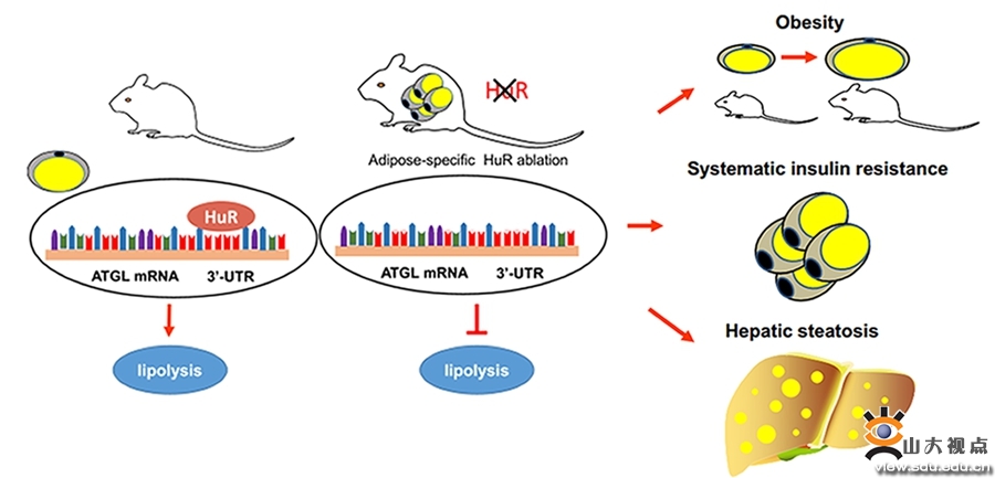 其中,关于肥胖发病机制的有关研究成果在英国《自然通讯》发表。根据近年世界卫生组织的统计,全球成年人逾19亿人超重,逾6.5亿人肥胖。肥胖是动脉粥样硬化性心血管疾病、2型糖尿病、非酒精性脂肪肝等常见疾病的重要危险因素,但肥胖发生和发展的分子机制和干预靶点不明。脂肪生成和分解过程是调节甘油三酯-脂肪酸循环稳态和决定脂肪组织体积的关键因素。在脂解过程中,甘油三酯被水解而释放脂肪酸和甘油进入血液,其中甘油三酯脂酶(ATGL)是催化此过程的关键限速酶,促进ATGL表达或提高其活性有助于防治肥胖。RNA结合蛋白HuR可与靶基因mRNA的3’非翻译区上的富含腺苷酸/尿苷酸的元件结合进而增加mRNA的稳定性,最终使蛋白生成水平增加。已知HuR参与多个基因表达的转录后调控,影响炎症等多个病理过程。心血管实验室张文程教授的前期研究发现,HuR在内皮细胞中调节一氧化氮的生成,论文发表在美国《循环》杂志,但HuR在脂肪细胞中的功能和作用尚无报道。张文程教授和张澄教授领导的课题组首次成功制备了脂肪组织特异性敲除HuR小鼠,发现高脂喂养状态下的HuR敲除小鼠的脂解过程明显受损,甘油三酯在脂肪和肝脏组织中大量累积,表现为更加严重的肥胖、胰岛素抵抗和脂代谢异常。进一步研究发现,脂解过程关键限速酶ATGL是HuR的靶基因,HuR可与ATGL mRNA直接结合,提高ATGL mRNA的稳定性,促进ATGL表达和脂解过程。临床研究证实,肥胖人群皮下脂肪组织中HuR的表达水平显著低于正常体重人群,且与个体的身体质量指数呈负相关关系。本研究进一步阐明了肥胖的发病机制,提示脂肪组织HuR基因可对抗由高脂饮食引起的肥胖和胰岛素抵抗,有望成为治疗肥胖及其相关疾病的新靶点。该研究已发表于英国《自然通讯》杂志,5年影响因子13.092,心内科博士生李静媛为第一作者,张文程教授、张澄教授为共同通讯作者,山东大学齐鲁医院为第一和通讯作者单位。