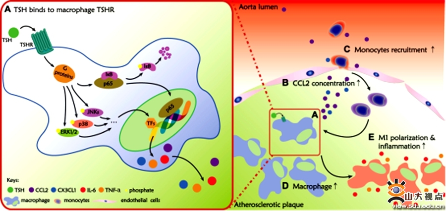 关于亚临床甲状腺功能减退症有关研究成果发表于美国《实验医学杂志》。亚临床甲状腺功能减退症(亚甲减)是指尚未出现甲状腺激素水平下降,而仅有促甲状腺激素(TSH)升高的状态,近年研究发现亚甲减可显著增加动脉粥样硬化的患病风险,但其分子机制不明。山东省立医院赵家军教授与山东大学齐鲁医院心血管实验室的张群业教授合作研究了这一问题。临床研究发现,亚甲减患者的动脉粥样硬化斑块发生率和血清炎症标志物水平显著高于正常对照人群,并与血清TSH水平显著正相关。课题组将Tshr-/-与ApoE-/-敲除小鼠杂交,发现Tsh基因敲除可延缓动脉粥样硬化,且斑块中巨噬细胞数量减少,炎症因子表达水平降低,提示TSH能够直接影响血管炎症,促进动脉粥样硬化。在巨噬细胞Tshr特异性敲除的ApoE-/-小鼠中,证明抑制单核细胞向斑块的募集是TSH抑制动脉粥样硬化和血管炎症的主要机制。该研究深化了亚甲减作为动脉粥样硬化危险因素的认识,并提示TSH是未来治疗动脉粥样硬化的潜在靶点。该研究发表于美国《实验医学杂志》,5年影响因子13.258。山东大学博士生杨重博为第一作者,赵家军教授和张群业教授为共同通讯作者,山东省立医院和山东大学齐鲁医院为并列通讯作者单位。