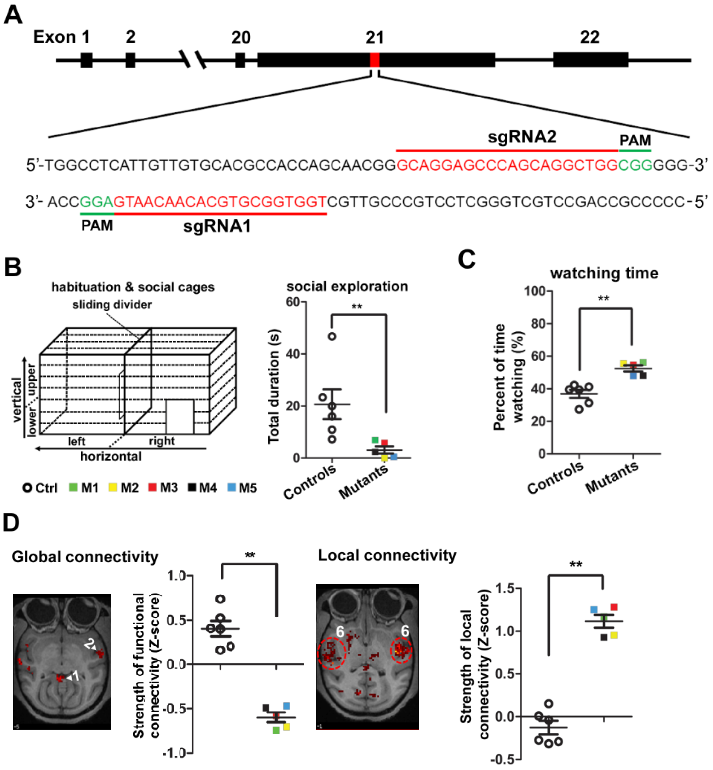 SHANK3基因突变猴表现出自闭症相关症状。A:SHANK3基因编辑示意图;B:突变猴社会交互减少;C:社会性刺激下突变猴眼运动异常;D:SHANK3基因突变导致大脑长程连接减弱,局部连接增强。