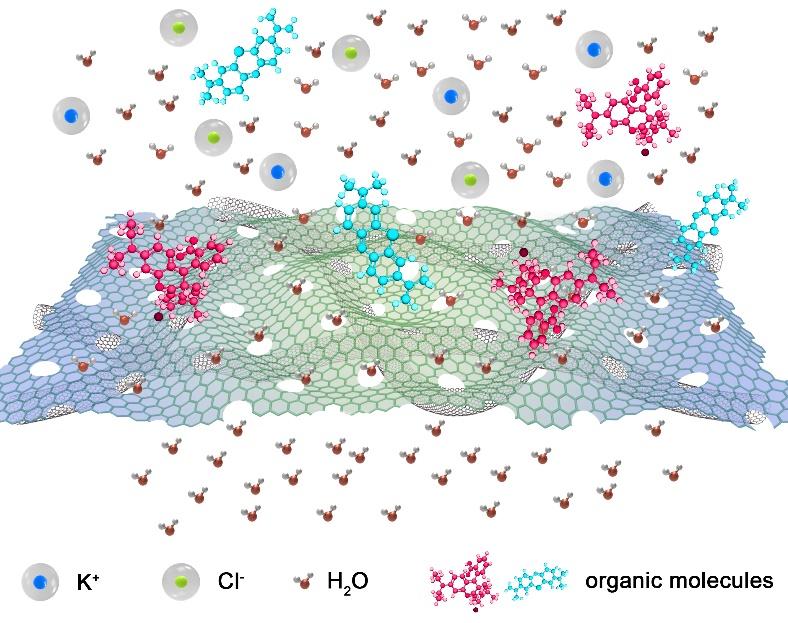 石墨烯纳米筛/碳纳米管纳滤膜选择性分离示意图