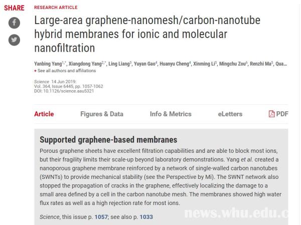 武汉大学新闻网讯(通讯员化苑)6月14日, Science (《科学》)在线发表了我校在纳米孔过滤薄膜领域的最新研究成果。