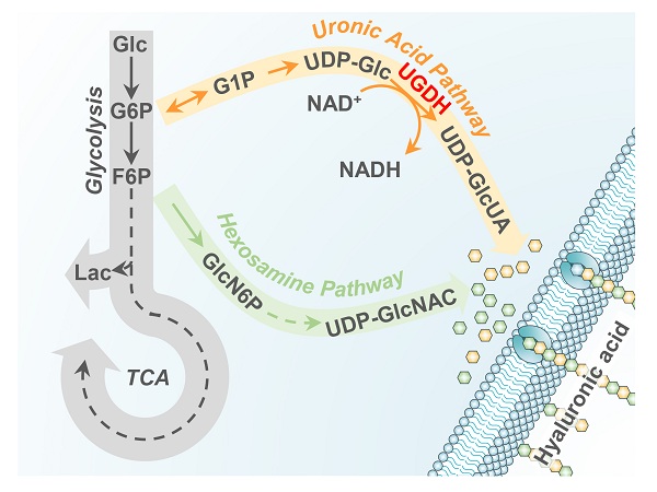 糖醛酸途径是糖酵解的分支通路。糖醛酸途径的原料来自于糖酵解的中间代谢产物葡萄糖6-磷酸。经过几步反应最终生成UDP-葡萄糖醛酸。UDP-葡萄糖醛酸与己糖胺途径(Hexosamine Pathway)生成的UDP-乙酰氨基葡萄糖一起用于糖胺聚糖,如透明质酸(Hyaluronic Acid, HA)等物质的生物合成。