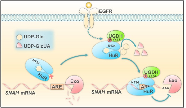 在该项研究中,他们发现在表皮生长因子受体(EGFR)激活的条件下,尿苷二磷酸葡萄糖脱氢酶(UGDH)第473位酪氨酸(Y473)发生了磷酸化。UGDH是糖醛酸途径的限速酶,可以催化UDP-Glc反应生成尿苷二磷酸葡萄糖醛酸(UDP-GlcUA);后者可以作为细胞合成糖胺聚糖的原料(图1)。磷酸化的UGDH可与HuR结合,并将UDP-Glc转化为UDP-GlcUA,从而削弱了UDP-Glc对HuR与SNAI1 mRNA结合的抑制,增强了SNAI1 mRNA稳定性及蛋白表达;SNAI1表达的升高增强了肿瘤细胞迁移能力,进而促进了肺癌转移(图2)。