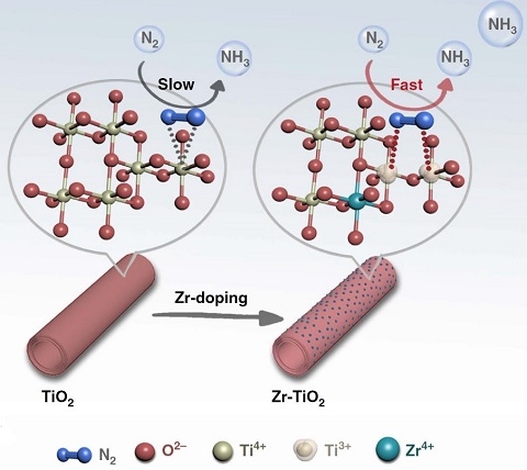 TiO2中掺杂单位点的Zr4+以引入双Ti3+活性中心,电催化固氮制氨体系的示意图