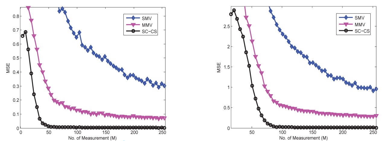 在SNR=-10dB环境下,不同方法的重构性能比较(信号稀疏度:左图为4,右图为16),其中纵坐标MSE表示重构信号与源信号的均方误差(Mean Squared Error, MSE),横坐标是测量值的数量(图/中科院声学所)