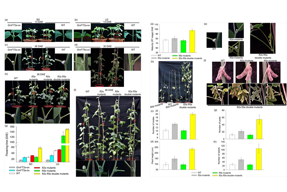 该研究通过构建 GmFT2a 和 GmFT5a 基因的过表达植株,并利用CRISPR/Cas9基因组编辑技术对 GmFT2a 和 GmFT5a 进行定点敲除,结合杂交手段,创制出单基因和双基因突变体材料。研究表明, GmFT2a 和 GmFT5a 虽然在大豆的花期调控中存在功能互补,但在长、短日照条件下的开花促进效应差异较大。在短日照条件下, GmFT2a 的开花促进效应比 GmFT5a 强,而 GmFT5a 在长日照条件下的开花促进效应更强。临界光周期对 GmFT5a 参与的大豆花期调控影响很大,超过品种临界光周期日长的条件下, GmFT5a 基因是主要的开花促进基因,是使大豆能够适应长日照环境的关键基因。研究人员还发现,创制的双基因突变体在短日照条件下平均57.4天开花,比野生型晚花约31.3天,株高和节数较野生型显著提高,单株荚数和粒数也显著增加,这为适合低纬度地区种植的大豆品种改良提供了新的基础材料。