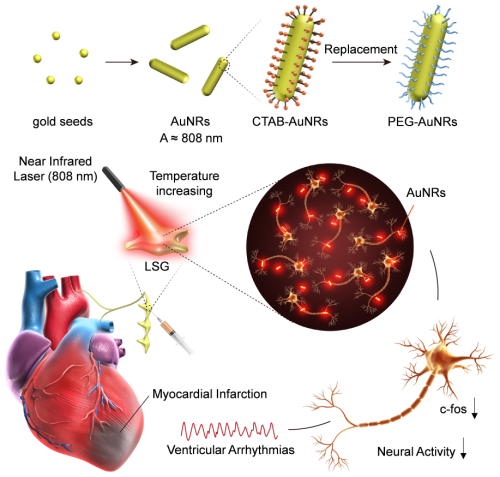 金纳米棒(gold nanorods,AuNRs)是一种具有优异光热效应纳米材料,而温度的改变与神经活性的变化密切相关,因此AuNRs的光热效应具备调节神经活性的潜力。基于此,研究团队首次将近红外照射下金纳米棒的光热效应应用于调控心脏功能的左侧星状神经节(LSG),通过在大型犬类动物急性心肌梗死模型中探究了AuNRs光热效应对心肌梗死后恶性室性心律失常的抑制作用。研究结果表明,AuNRs的体内光热效应可显著抑制心肌梗死后过度激活的LSG功能与神经活性,同时还可有效抑制VAs的发生。值得注意的是,相比于临床上传统的神经节切除术,该调控方式并未破坏LSG的正常结构和生理功能,为可逆性调控,在调控交感神经的同时保留了其正常的生理功能,更具应用价值。