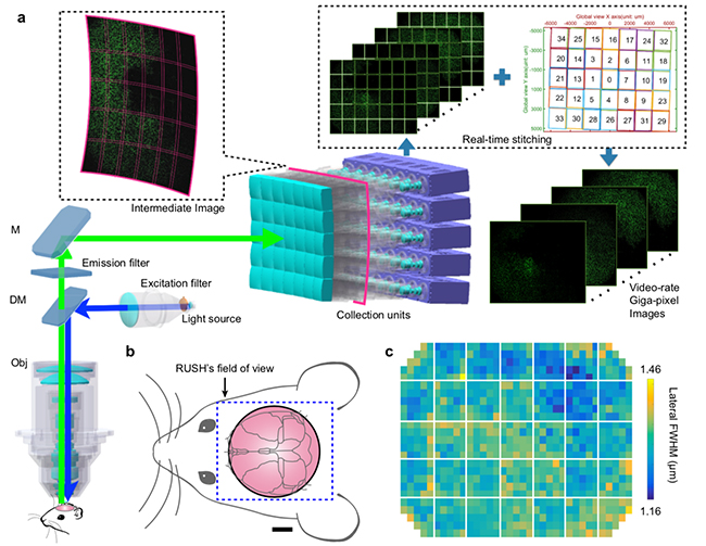 在这项研究工作中,团队将光学、微电子、计算机视觉以及信号处理等学科交叉,提出了多尺度曲面中继协同显微成像新架构:通过物方平场像方曲场的物镜将样本放大到曲面中继像,像感器阵列分区域同步并行拍摄中继像近似平场的小区域,经计算重建为无缝的宽视场高分辨率动态图像序列。基于此架构,研制了“实时超宽场高分辨率成像显微镜”(Real-time, Ultra-large-Scale, imaging at High-resolution macroscope,RUSH),兼具1厘米×1.2厘米超宽视场、全视场均一的1.2微米高分辨率、30帧每秒高帧率,数据通量高达51亿像素每秒。