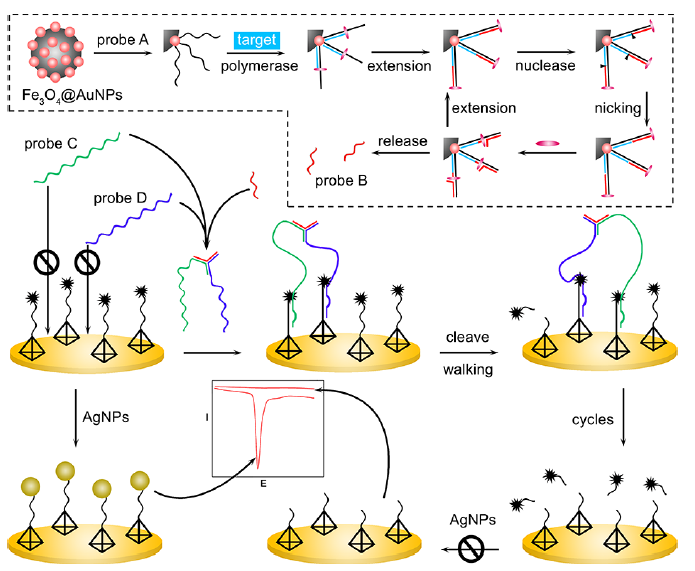 核酸是遗传信息的携带者和基因表达的物质基础,核酸结构与功能的关系不仅是生物化学与分子生物学学科的研究重点,也是相关遗传性疾病与传染病临床诊断的重要依据。针对核酸的分析方法已在生命科学研究、药物筛选、分子诊断、环境监测等领域取得了迅速的发展。传统的凝胶电泳与聚合酶链式反应等技术存在复杂的操作与试剂的高毒性等缺点,因此需要发展新型的操作简便、快速灵敏的核酸分析方法。 DNA步行器是一类特定DNA结构在链置换或酶催化反应驱动下沿特定轨道定向移动的DNA纳米机器,一般由轨道组件、步行组件和驱动组件所构成。步行组件的不断移动一般是通过设计有偏向的系统状态实现的,从高能态到较低能态的自动转变驱动纳米机器的运行,该过程的实现伴随着能量的消耗。目前,研究人员已设计构建了各种轨道精确、自动运行的DNA步行器,并应用于药物输送,生物分子检测、细胞成像等诸多生物医学领域的应用中。 近期,苏州医工所缪鹏研究员课题组基于DNA步行器设计了多种针对核酸的超灵敏电化学分析方法。首先设计了基于切刻内切酶催化的电化学传感器,通过在电极界面以不同比例修饰DNA轨道分子与步行分子,在目标分子存在下组装成DNA三角星纳米结构,起始酶切步行反应,通过检测后标记的电信号分子的响应强度实现对目标核酸的检测;接着设计了一个无标记的自行走阻抗传感器,在组装的DNA四面体不同顶点处安置DNA步行器各组件,最终在辅助DNA探针存在条件下,显著改变电极界面的电阻值,从而实现对目标核酸分子的快速简便地检测;随后,进一步设计了双足DNA步行器,首先在合成的金磁复合纳米颗粒表面进行一步链置换聚合反应,生成的单链DNA辅助组装双足DNA步行组件,并与电极界面修饰的DNA分子杂交形成Pb2+依赖型DNAzyme,驱动双足步行,通过检测吸附的银纳米颗粒的溶出伏安响应,实现高灵敏度的核酸检测。这些基于DNA步行器的电化学分析方法不仅可以实现低丰度核酸的特异性检测,还具有反应条件温和,成本低,可扩展性强等优点,在生物分析和基于核酸检测的疾病诊断方面展示出极大的应用潜力。 相关工作得到了国家自然科学基金面上项目(81771929)、政府间国际科技创新合作重点专项(2017YFE0132300)、中国科学院科研装备研制项目(YJKYYQ20170067)等项目的资助。相应的研究成果已发表(Anal. Chem., 2019, 91, 4953-4957; Electrochem. Commun., 2019, 99, 51-55; Electrochem. Commun., 2019, 101, 1-5; New J. Chem., 2019, 43, 7928-7931)。 论文链接: https://pubs.acs.org/doi/10.1021/acs.analchem.9b01118 https://www.sciencedirect.com/science/article/pii/S1388248119300037 https://www.sciencedirect.com/science/article/pii/S1388248119300426 https://pubs.rsc.org/en/content/articlelanding/2019/nj/c9nj00158a