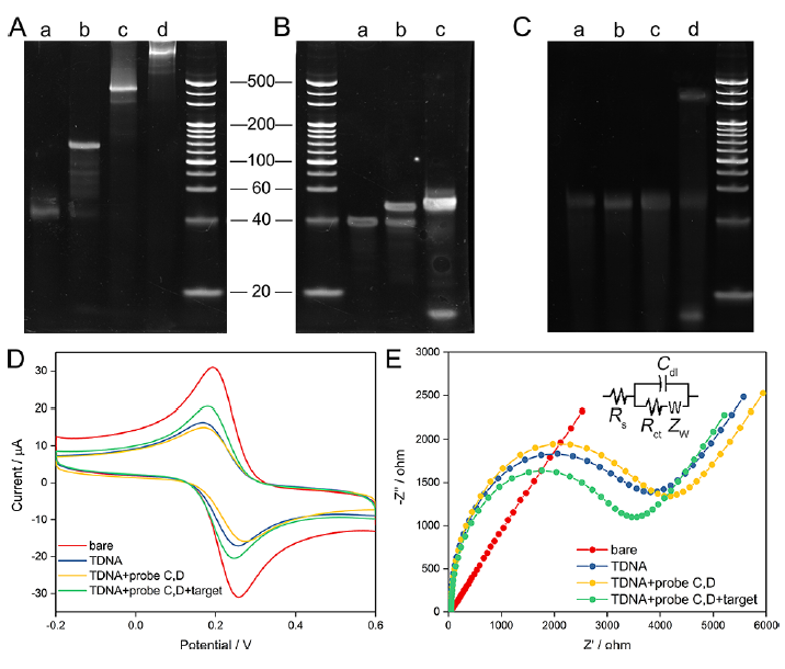 图2 (A)DNA四面体形成、(B)链置换反应及(C)双足DNA步行的聚丙烯酰胺凝胶电泳验证。(D)循环伏安与(E)交流阻抗谱验证电极界面反应过程