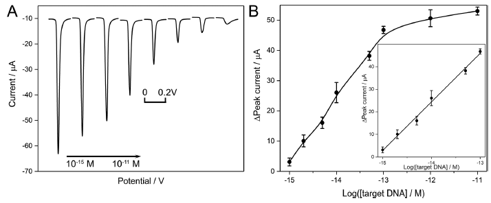 图3 (A)基于双足步行器进行核酸检测的线性扫描伏安图。(B)对应的标准曲线 |