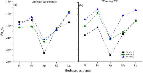 图5. 在2015年(a)对照和(b)增温2°C样地,生长的草本植物Pl、Sp、Pb、Kh和Lg中δ2Halk值的差异,及其在减水50%(黑)、正常降水量(绿)和加水100%(蓝)三种降水量控制生长条件下的变化.
