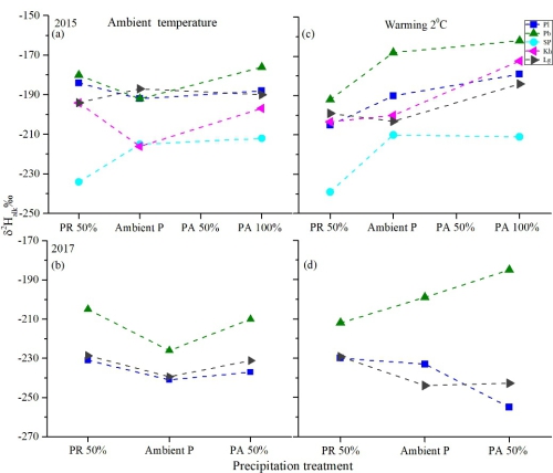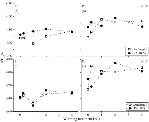 图3. 在对照降水和增加降水样地 (2015年PA 100%; 2017年PA 50%)生长的草地早熟禾(Pl;a和c)和二裂委陵菜(Pb;b和d)δ2Halk值对不同增温控制生长条件的响应