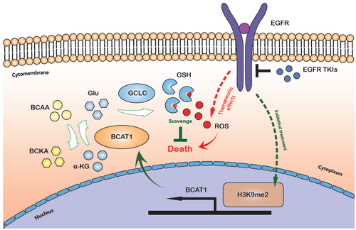 该项工作进一步揭示了这种适应性反应的分子基础,主要涉及表观遗传调控介导的代谢重编程。在肺癌细胞适应药物治疗的过程中,组蛋白H3K9甲基化水平会发生下调,从而诱导支链氨基酸氨基转移酶1(BCAT1)表达水平的上调,使肿瘤细胞更多地依赖支链氨基酸代谢来促进还原型谷胱甘肽的合成,最终实现有效地清除靶向治疗引发的胞内活性氧簇堆积来逃脱药物处理。