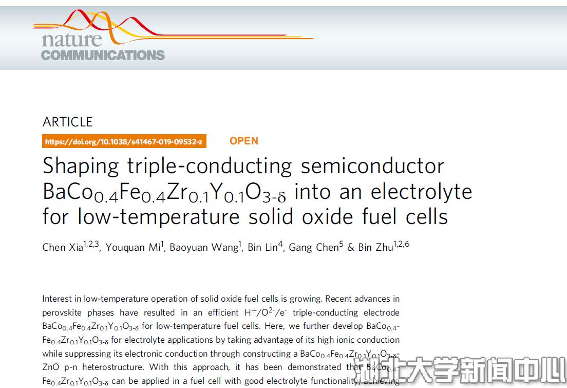 近日,我校物理与电子科学学院朱斌教授团队在低温固体氧化物燃料电池电解质方面取得突破性进展,相关研究成果以“Shaping triple-conducting semiconductor BaCo0.4Fe0.4Zr0.1Y0.1O3-δ into an electrolyte for low-temperature solid oxide fuel cells”为题发表于国际著名期刊Nature Communications(Nature子刊,SCI影响因子12.353)。物电学院青年教师夏晨为论文的第一作者,朱斌教授和汪宝元副教授为共同通讯作者,湖北大学是该论文的第一完成单位和通讯单位。
