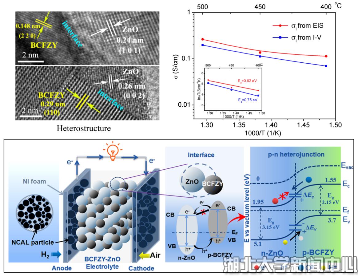 为了充分利用BCFZY在低温下的优势并消除其电子电导的负面影响,朱斌教授团队提出了pn异质结构电解质的想法,即通过引入n型半导体ZnO与p型半导体BCFZY构建异质结构复合电解质,利用体异质结促进离子的运输并且阻挡电子的导通,从而实现电解质功能。研究发现,所制备的BCFZY-ZnO电解质具有大量的异相界面,应用于低温SOFC后能够实现理想的开路电压和输出功率,排除了电子的短路问题。通过对交流阻抗谱和极化曲线的分析,研究发现该材料具有优异的混合质子/氧离子电导率(500℃达到0.20 S/cm)。基于对两种半导体在SOFC气氛下导电类型以及能级位置的测试,研究团队从能带理论的角度分析了电解质中体异质结内建电势对离子运输的促进机制以及对电子的阻挡作用。这一研究成功地将离子导电型半导体整合到SOFC的电解质层中,为发展高性能的低温电解质提供了一个全新的思路。该项工作依托于物电学院“铁电压电材料与器件”湖北省重点实验室与“湖北省百人计划”团队,得到国家自然科学基金的资助。