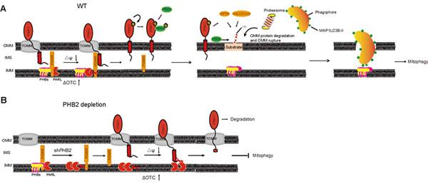 PINK1是定位在线粒体内膜的蛋白,在正常的线粒体中,PINK1进入线粒体内膜会被线粒体蛋白酶PARL识别并剪切,随后PINK1被蛋白酶体降解。而在受损的线粒体中,PINK1会被稳定在线粒体外膜上,随后招募Parkin促进线粒体自噬。但是PINK1是如何从线粒体内膜转位到线粒体外膜上的机制还是空白。研究发现,PHB2可稳定线粒体内膜蛋白酶PARL,并阻止PARL对于PGAM5的剪切,完整的PGAM5可将PINK1稳定在线粒体外膜上,随后招募Parkin和线粒体其它受体如NDP52,促进线粒体自噬。