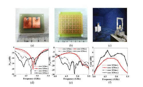 超材料是由人工设计的复合材料,具有一些天然材料所不具备的超常物理性质,该团队设计了具有超宽带超材料提升5G MIMO天线系统性能,通过将超材料结构放置在5G MIMO天线的上方做为覆盖层,在极近的天线距离(1毫米,即0.017个波长)下实现了良好的耦合抑制效果,同时增加了5G MIMO天线的工作带宽和辐射增益,并制造实物实验验证了理论分析的正确性。该项工作为实现宽带近距离的5G MIMO天线小型化系统提供了新的思路。