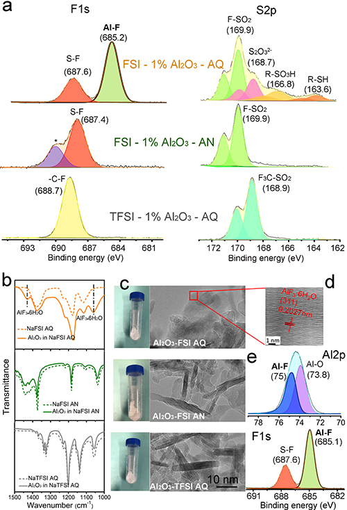 | 图2. (a) FSI-1%Al2O3-AQ、FSI-1%Al2O3-AN和TFSI-1%Al2O3-AQ电解质膜的XPS图谱;(b) Al2O3分别在NaFSI水溶液、NaFSI乙腈溶液合NaTFSI水溶液中反应后的红外光谱;(c) Al2O3分别在NaFSI水溶液、NaFSI乙腈溶液和NaTFSI水溶液中反应离心后的照片和TEM图;(d-e) Al2O3在NaFSI水溶液中反应离心后的高分辨TEM图(d)和XPS图谱(e). |