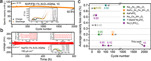 | 图3. (a)NVP|FSI-Al2O3-AQ|Na的长循环性能及其循环过程中的阻抗变化;(b)Na|FSI-Al2O3-AQ|Na的循环性能及其循环过程中的阻抗变化;(c)聚合物固态钠电池的平均容量衰减率总结 |