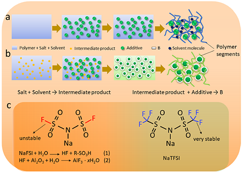 | 图1. (a-b)SPE制备过程示意图:a)传统过程;b)所设计的过程;(c)NaFSI和NaTFSI的化学结构 |