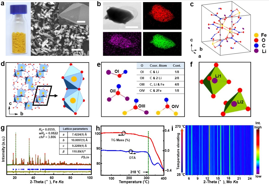 图1 新型正极材料表征(a,b)、晶体结构解析(c-f)以及纯度(g)与热稳定性能表征(h,i)