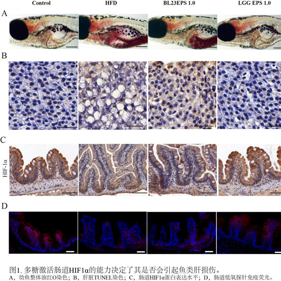 该研究以鼠李糖乳杆菌和干酪乳杆菌胞外多糖为研究对象,分别将其添加至高脂饲料中投喂斑马鱼。结果表明添加2种多糖均可以降低肝脏中脂肪的积累;但是添加干酪乳杆菌胞外多糖会导致肝脏损伤,而添加鼠李糖乳杆菌胞外多糖则不会。进一步研究表明鼠李糖乳杆菌胞外多糖可以通过肠道膜受体激活低氧诱导因子的表达,低氧诱导因子进一步促进肠上皮细胞分泌抗菌肽,从而改善肠道菌群结构,增加梭杆菌门丰度,降低变形菌门丰度。而且改善后的鱼类肠道菌群,以梭杆菌门为优势菌,而梭杆菌门代谢性活性物质具有降低肠道氧含量、激活低氧诱导因子的作用,进一步维护肠道环境,减少内毒素产生,保护肝脏。而干酪乳杆菌胞外多糖不具有激活低氧诱导因子的作用,且多糖类可被肠道细菌利用进一步导致肠道菌群异变,变形菌门数量增多,内毒素产生增多,加剧肝脏损伤。