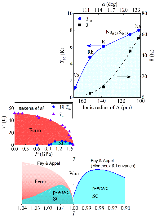 图1:A2Cr3As3体系的相图(上)、UGe2压力下的相图(中)以及铁磁QCP附近的理论相图(下)。Tsc代表超导转变温度,θ为表征磁涨落强度的物理量,是从对1/T1T数据进行拟合(1/T1T∝1/ (T +θ))得到的。θ越小,代表离铁磁QCP越近。从Na到Rb,系统逐渐向铁磁QCP靠近。 |