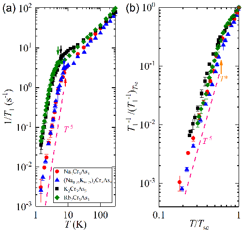 | 图2:(a)四个样品1/T1随温度变化。箭头代表Tsc(b)用Tsc处的数据归一化后的1/T1,箭头代表特征温度T*,低于T*时1/T1正比于T5,表明能隙中存在点状节点。 |