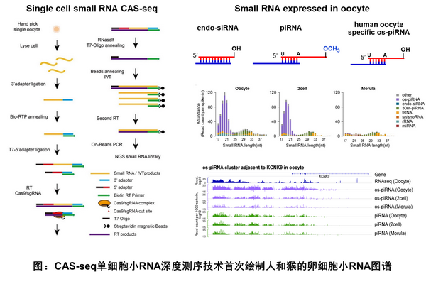 7月29日,国际学术期刊Nature Communication 在线发表了中国科学院分子细胞科学卓越创新中心(生物化学与细胞生物学研究所)吴立刚和李逸平实验室的研究成果:“Single-cell CAS-seq reveals a class of short PIWI-interacting RNAs in human oocytes"。该研究发明了单细胞小RNA深度测序技术CAS-seq,并运用该技术绘制了首个人和猴卵细胞的小RNA表达谱,鉴定发现了一类新的小RNA家族。