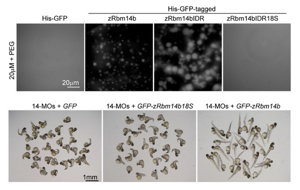 该组研究人员发现一个参与斑马鱼背腹轴建立的因子Rbm14。研究者证明其通过维持多个BMP信号通路因子如 Nanog, Smad4/5, Id1/2的蛋白水平,促进胚胎腹侧发育。抑制Rbm14表达可造成斑马鱼胚胎的背部化(dorsalization)。鼠源Rbm14的IDR已被报道在体外能通过相分离形成水凝胶。斑马鱼Rbm14的IDR尽管与小鼠的同源性很低,但也能能通过相分离形成液滴,说明IDR中保守的是相分离能力而非氨基酸顺序。外源表达野生型Rbm14能恢复胚胎的正常发育,而相分离所需的关键氨基的酸突变则不再能挽救胚胎背部化,提示Rbm14的相分离可能参与其在背腹轴的调控。