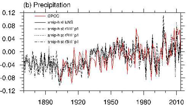 图2 GMMIP Tier-1试验FGOAL-f3-L 模拟的全球陆地降水异常年平均的长期时间序列(1870-2014),与观测有很好的一致性