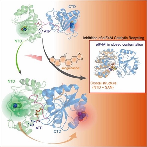近日,基础医学院生化与分子生物学系代谢分子医学教育部重点实验室党永军团队在靶向真核翻译起始因子eIF4AI抑制剂作用机制研究方面取得重要进展,发现了天然产物血根碱抑制eIF4AI酶活,并揭示了该抑制剂的分子机制。相关研究成果于8月8日以《Targeting the N-terminus of eIF4AI for Inhibition of its Catalytic Recycling》为题在线发表于Cell子刊Cell Chemical Biology杂志。