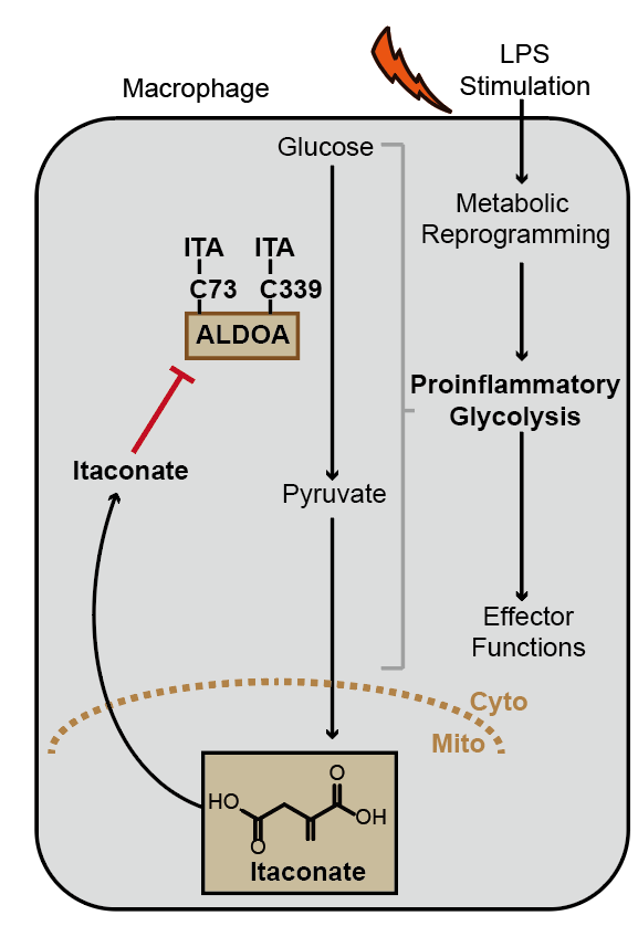 作者进一步分析发现糖酵解中的三个关键酶ALODA,GAPDH和LDHA都可以被衣康酸修饰,其中最上游的ALDOA蛋白中两个半胱氨酸(Cys73和Cys339)上在被脂多糖刺激的巨噬细胞中发生了内源的衣康酸修饰。生化和细胞实验表明衣康酸可以通过修饰这两个半胱氨酸残基显著地抑制ALDOA的催化活性,进而抑制巨噬细胞内的糖酵解通路,从而发挥抗炎活性。