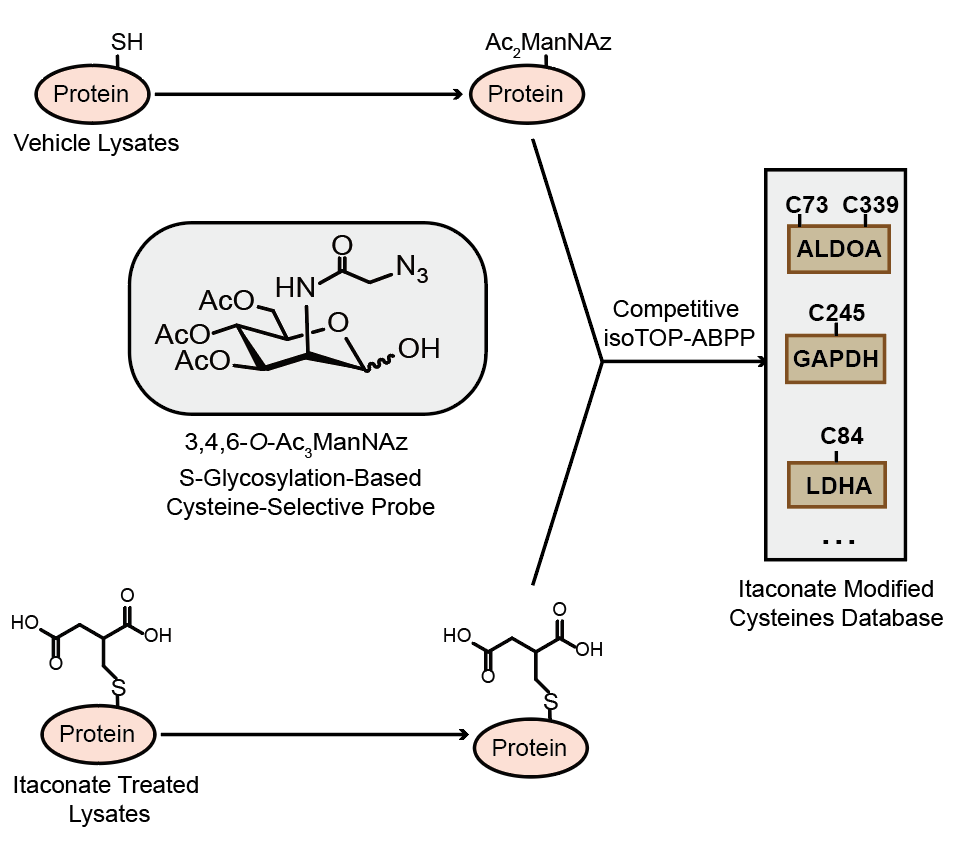 小分子代谢物和蛋白的相互作用在各种生物学过程中都发挥着至关重要的作用,发展化学蛋白质组学技术系统分析蛋白-代谢物相互作用网络可以促进对其生物学意义的理解。衣康酸是近年来在巨噬细胞中发现的一类具有显著抗炎活性的代谢小分子,但其抗炎机制尚不明确。由于衣康酸具有一个α,β不饱和羧酸的结构,理论上它可以通过迈克尔加成反应共价修饰到蛋白质的半胱氨酸残基上。此前,两个课题组合作发现,用于非天然糖代谢标记的全乙酰化叠氮糖探针,在细胞中可以通过无酶催化形式标记蛋白质组中大量的半胱氨酸位点(Qin W., et al.Angew. Chem. Int. Ed.2018.)。基于该反应,两个课题组在本工作中合作开发了新一代特异性半胱氨酸标记糖探针1-OH-Az,并结合定量化学蛋白质组学技术,成功地在巨噬细胞蛋白质组中鉴定到260个衣康酸修饰的半胱氨酸位点。