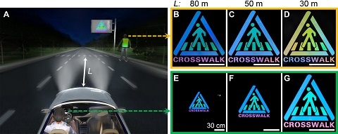 (A)逆反射结构色薄膜制备的交通反光标牌在夜间道路上应用的示意图,以及车辆距离标牌不同距离L时(80米、50米、30米)(B-D)行人视角和(E-G)司机视角的照片